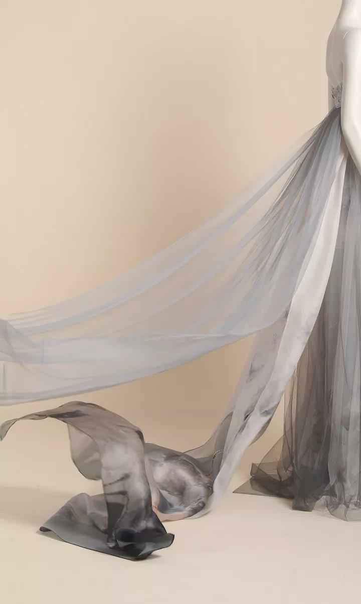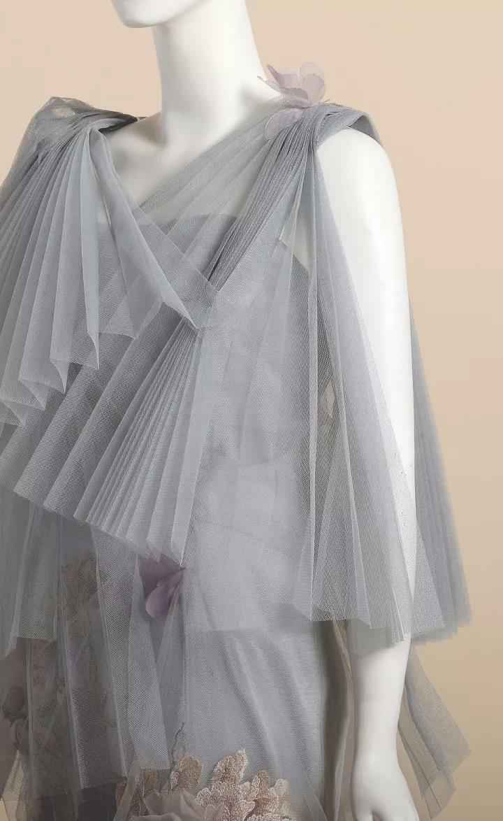 《风荷舞》作品一共分为三组,设计灵感来源于中国水墨画中风中荷叶飞舞的意像,作品采用了手绘、刺绣、晕染绣等工艺,将中国传统美学与现代设计完美融合,让东方女性如同风中轻舞的墨荷,摇曳生姿,动静之中展现变幻的灵性之美。